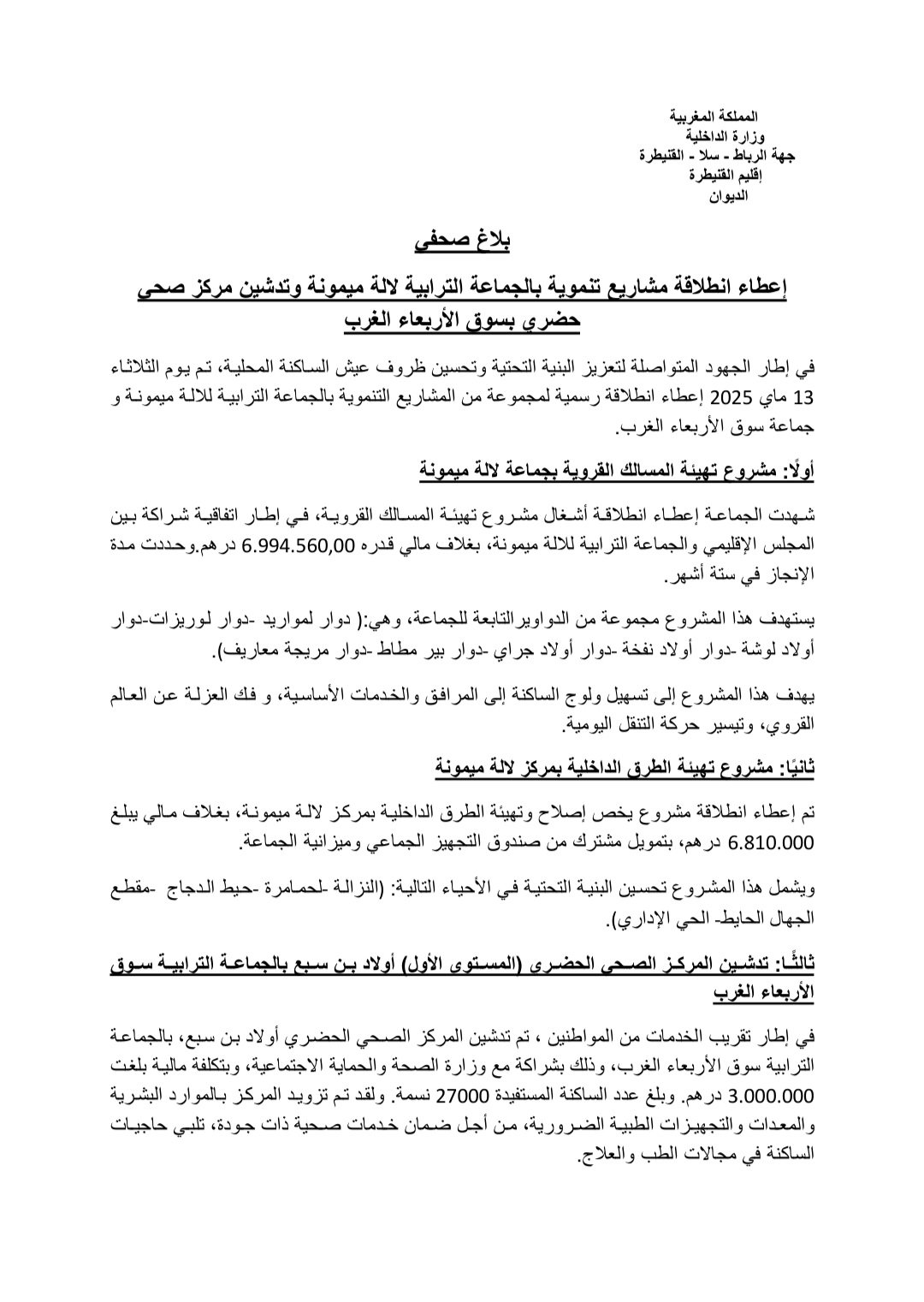 غير مصنف إعطاء إنطلاقة مشاريع تنموية بالجماعة الترابية لالة ميمونة وتدشين مركز صحي حضري بسوق الأربعاء الفرب By AZIZ NAOUI - 13 مايو 2025 0 19 FacebookTwitterPinterestWhatsApp
