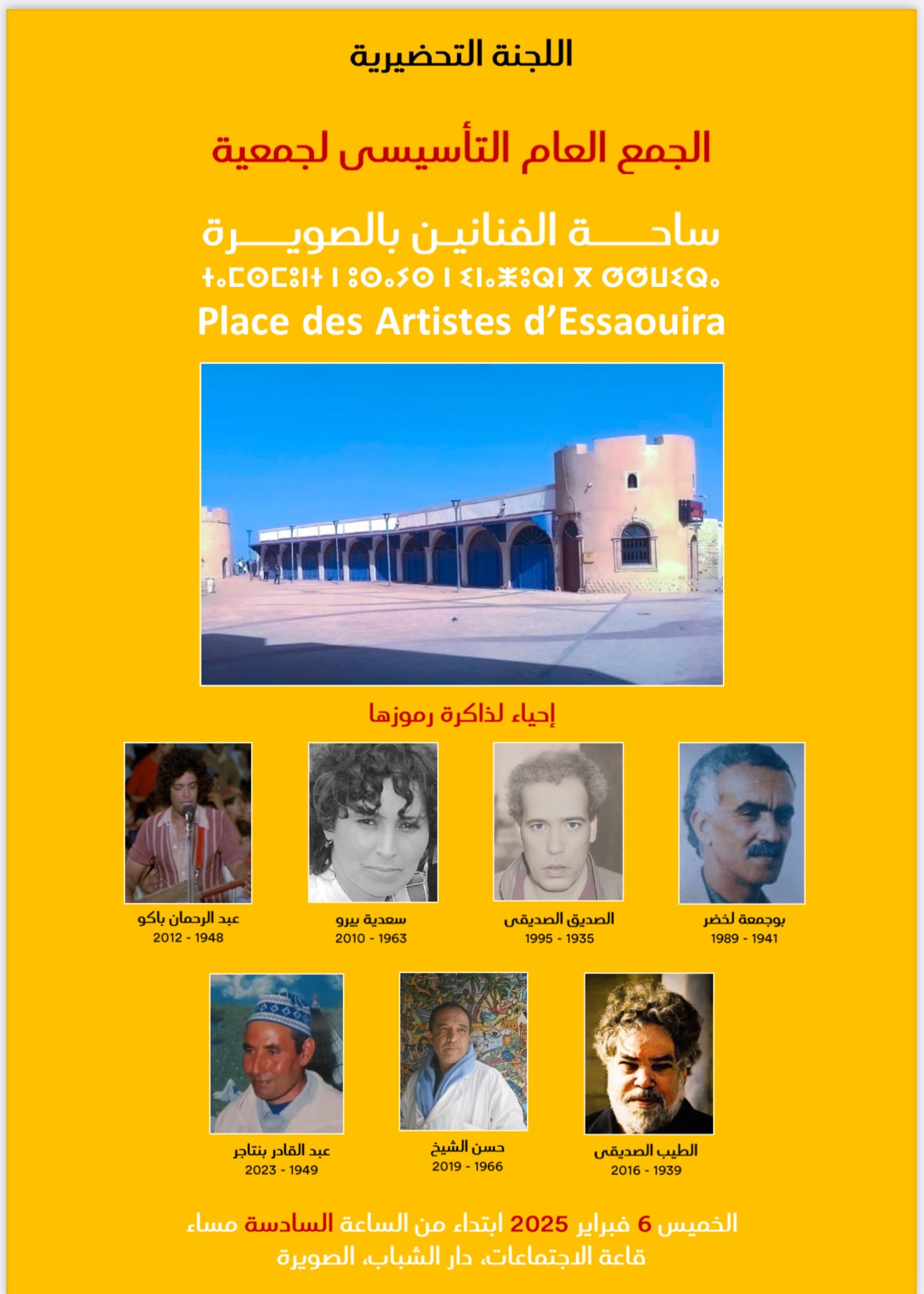 تعزيزا للنسيج الجمعوي الثقافي والفني بالصويرة، تحتضن قاعة الاجتماعات بدار الشباب الجمع العام التأسيسي لجمعية ساحة الفنانين يوم الخميس 6 فبراير 2025 ابتداء من الساعة السادسة مساء، وذلك إحياء لذاكرة رموز هذه الساحة النموذجية: بوجمعة لخضر، الصديق الصديقي، سعدية بيرو، الطيب الصديقي، عبد القادر بنتاجر، عبد الرحمان باكو وحسن الشيخ.