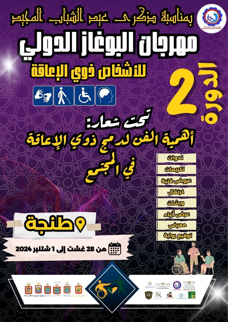 بمناسبة عيد الشباب المجيد، الذي يخلد ذكرى ميلاد صاحب الجلالة الملك محمد السادس، تنظم جمعية البوغاز لذوي الاحتياجات الخاصة، من 30 غشت إلى فاتح شتنبر 2024 بمدينة طنجة، فعاليات الدورة الثانية لمهرجان البوغاز الدولي للأشخاص ذوي الإعاقة، تحت شعار”أهمية الفن لدمج ذوي الإعاقة في المجتمع”.